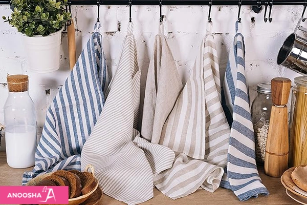 - دستمال نخی و کتان: دستمال آشپزخانه نخی سبک، بادوام و سریع خشک است. برای دستمال نظافت آشپزخانه عمومی سطوح و میوه ها کاربرد دارند.