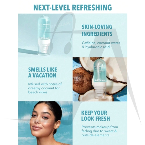 اسپری فیکس شیگلم SHEGLAM رنگ آبی با رایحه دلنشین نارگیل، حس و حال یک تعطیلات ساحلی را به شما می دهد و آرایش شما را از صبح تا شب تازه نگه می دارد. اگر نگران محو شدن آرایش به خاطر تعریق یا عوامل محیطی هستید، این اسپری آب شیگلم آبی مثل یک معجزه عمل می کند. فرمولاسیون آن کاملاً وگان، بدون گلوتن، پارابن، تالک، سیلیکون، الکل، فتالات، سولفات و روغنهای معدنی است و برای دوستداران حیوانات هم خبر خوبی داریم چون کرولتی فری (بدون تست حیوانی) و قابل بازیافت است. این اسپری با داشتن موادی مثل عصاره آلوئه ورا و هیالورونیک اسید، حس طراوت و شادابی به پوست میدهد.