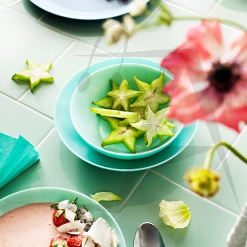 خورشت خوری و پیش دستی ایکیا مدل BESEGRA، یک انتخاب عالی برای میز پذیرایی های شماست. جنس این ظروف ایکیا از شیشه سکوریت با کیفیت بالا بوده و با اینکه ظاهری شبیه به چینی استخوانی دارد اما هزینهی کمتری دارد، بدون اینکه از زیبایی و جلوه اش کم شود. رنگ فیروزهای روشن و دلنشین این ظروف ایکیا، به سفره شما طراوت خاصی می بخشد و می توانید آن را با رنگ های دیگر هم ترکیب کنید تا چیدمانی منحصر به فرد داشته باشید.